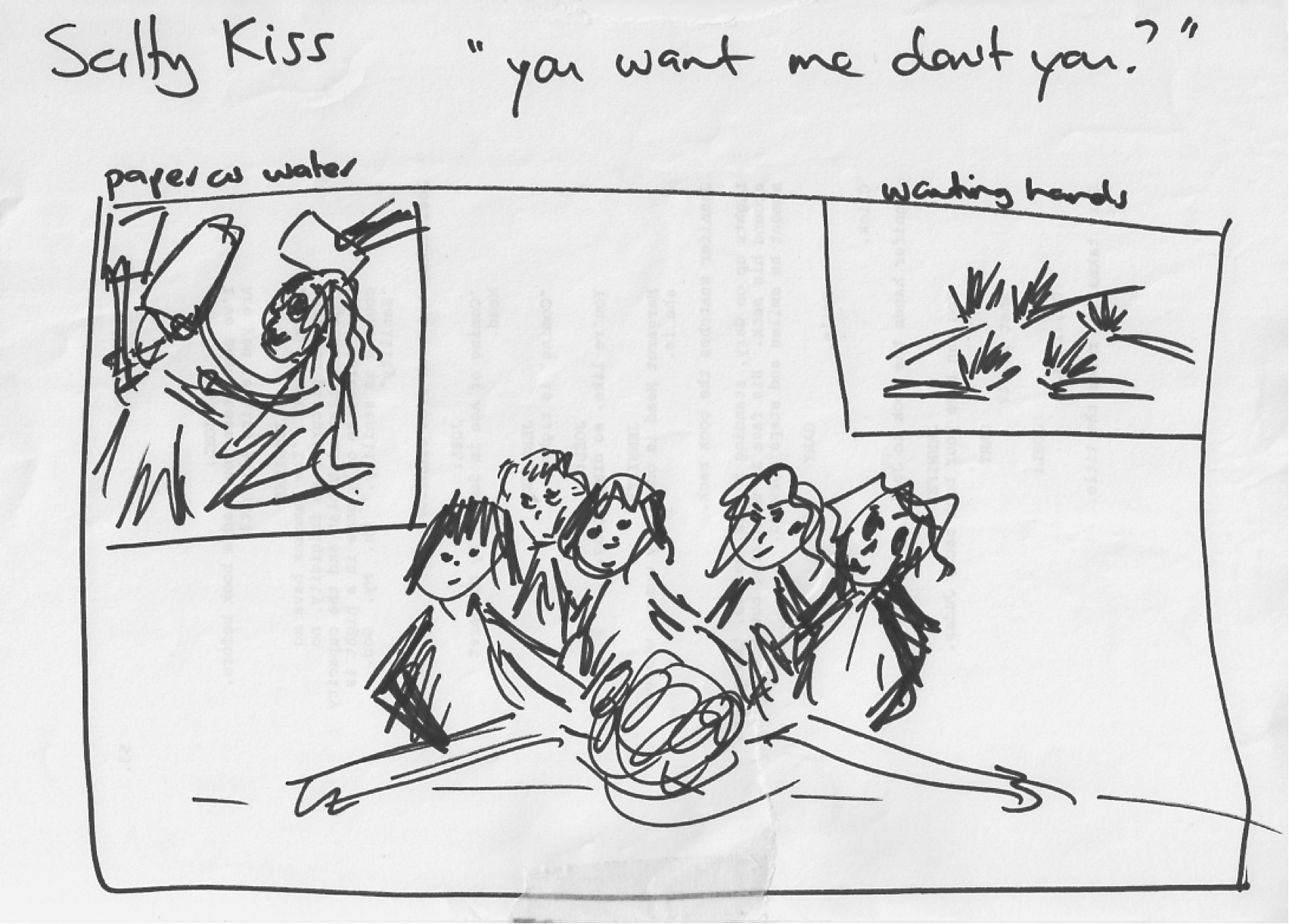 Here’s some pictures. At Improbable’s Making It Up workshop that I co-taught just before we started our latest rehearsal period on TaniwhaThames, Lee Simpson talked about making quick sketches as we went along, of points that seem to hold interest/be hot spots. Now, I ‘don’t draw/can’t draw’, not since I was about 5 years old. Seriously. It’s one of those I-can’t-do-it things. And yet, because I tried, while also not-trying, because the idea with these sketches was to capture the FEELING not the scene … I actually got some images that were both useful and fine for me to share.