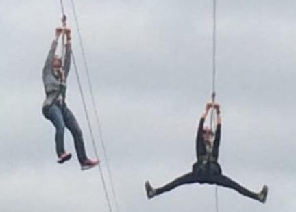 Me (54) and Shelley (58) zip-wiring yesterday to raise funds for Diversity Role Models.