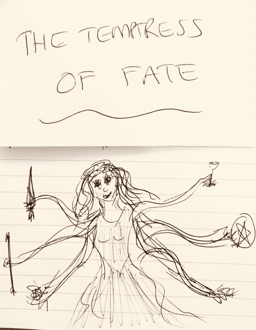 Here’s my six-armed Temptress of Fate – one hand for each of the tarot suits and two empty hands for Everything Else. (And how brave am I for sharing a drawing??!!)