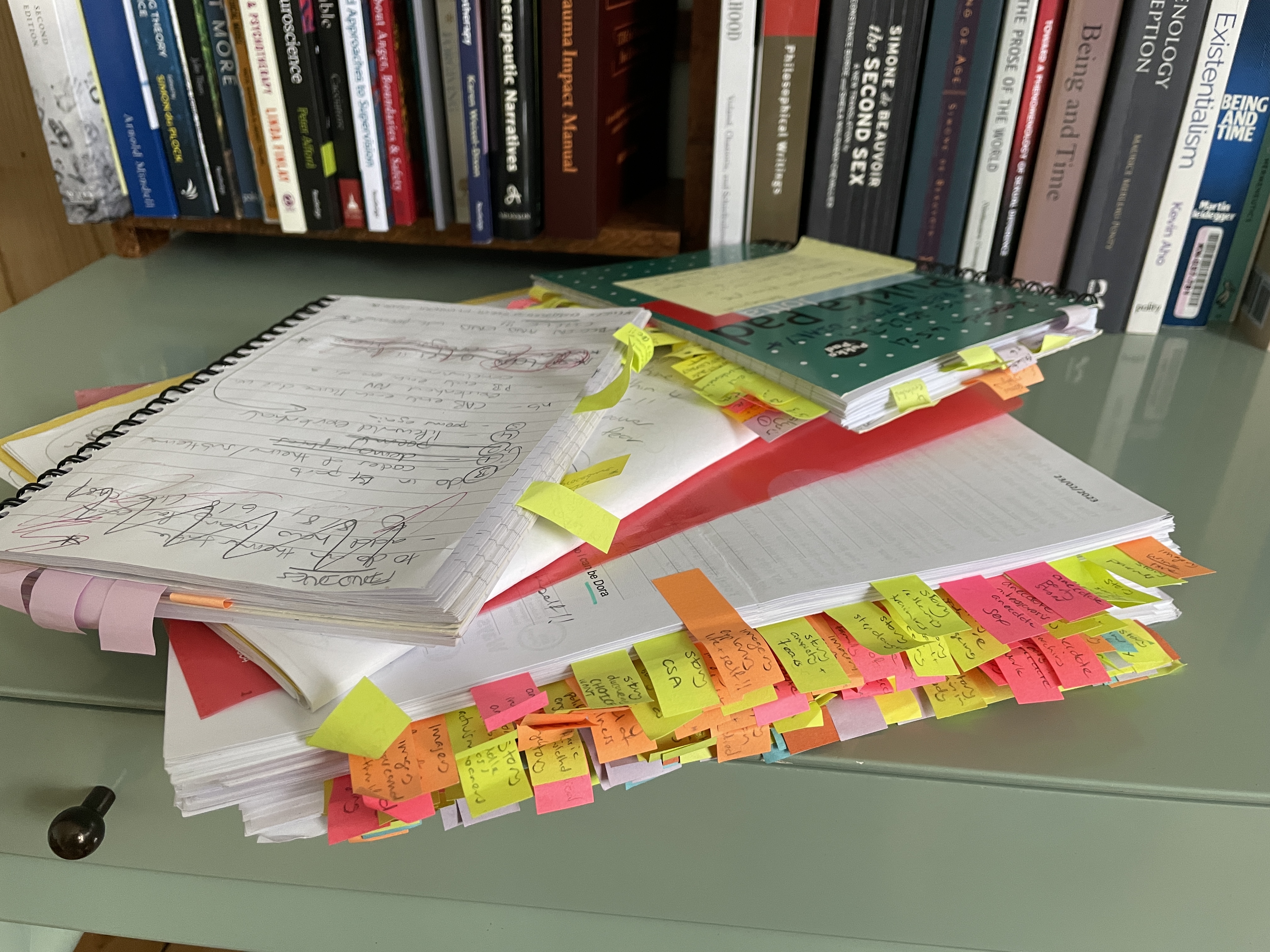 Having sent this chunk of work off to my supervisors, I remembered that I’d had a dream of writing my thesis in a time and space where I did nothing else and existed merely in a suspended state of research writing heaven. When actually I have done all the thesis work – ethics, methodology, finding participants, interviews, transcribing, writing up etc – around the work I’m already doing; private psychotherapy practice, further training in couples and group therapy, advanced intensives in existential therapy theory and practice, running a group for older people on ageing, continuing with my final placement and writing a story (which includes menopause research) for Virago’s 50th anniversary anthology Furies. (Why yes, it is an unfunded PhD – could you tell?!)