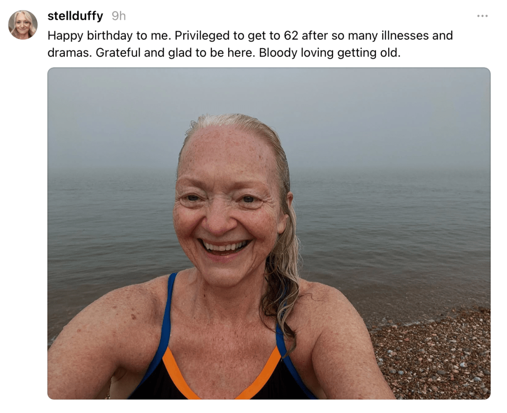 I am a) bloody thrilled to be alive, however much I’m also falling apart and b) equally thrilled to be getting old. And I said so in a couple of social media posts like this.